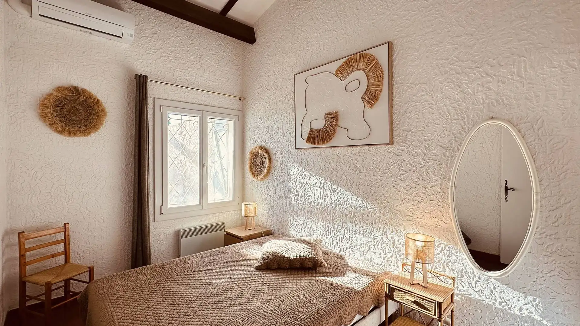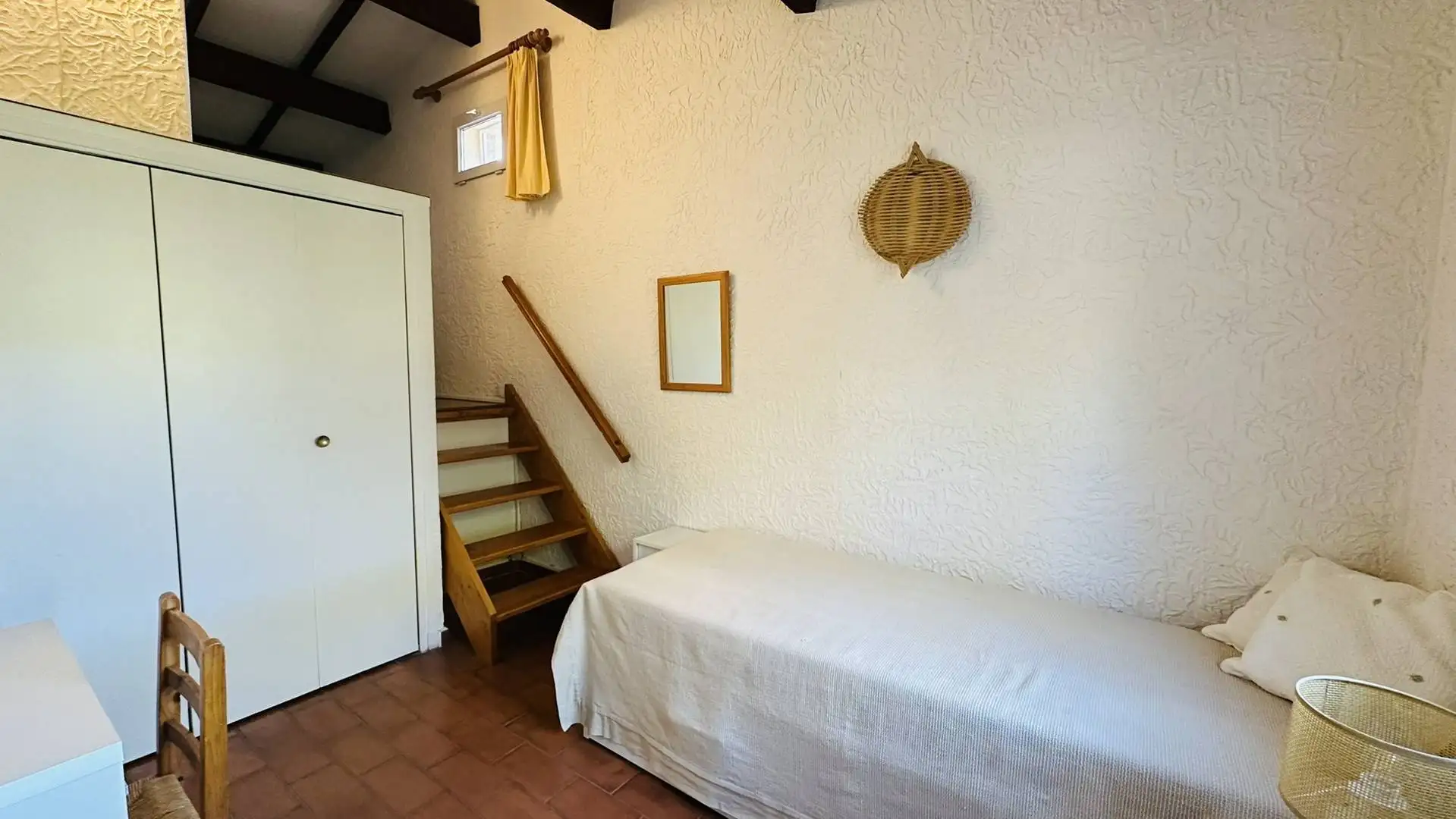 La maison dispose de deux chambres, dont une avec mezzanine, ainsi que de deux salles d’eau et de deux toilettes, un agencement appréciable pour un séjour à plusieurs. Les espaces nuit sont climatisés. L’une des chambres est équipée d’un lit double, tandis que la seconde est aménagée sur deux niveaux et comprend deux lits gigognes et deux lits simples, une configuration bien adaptée aux enfants ou aux adolescents.
