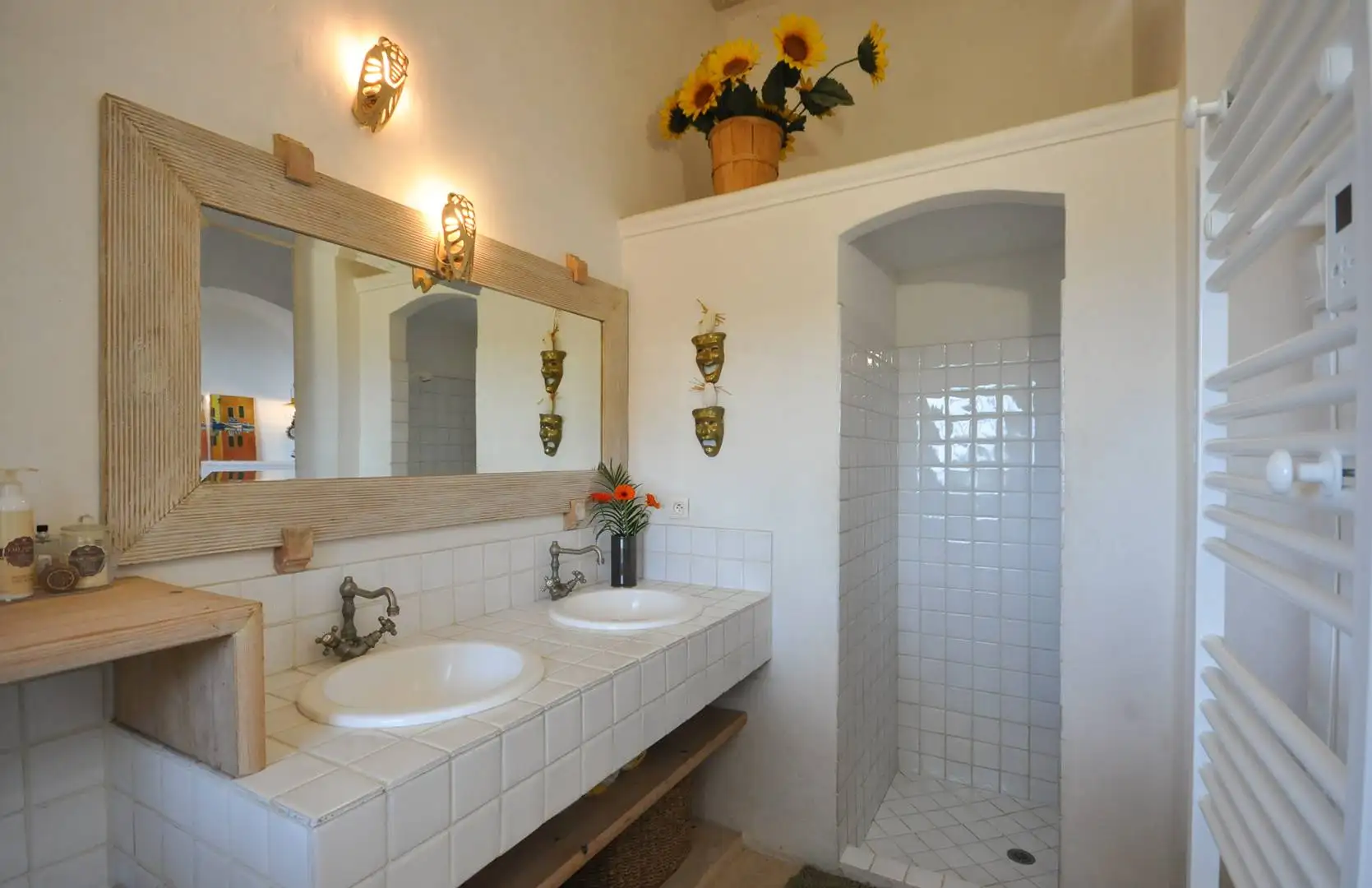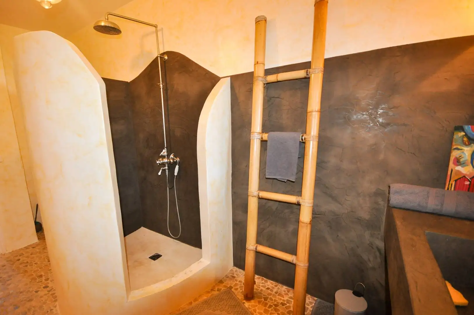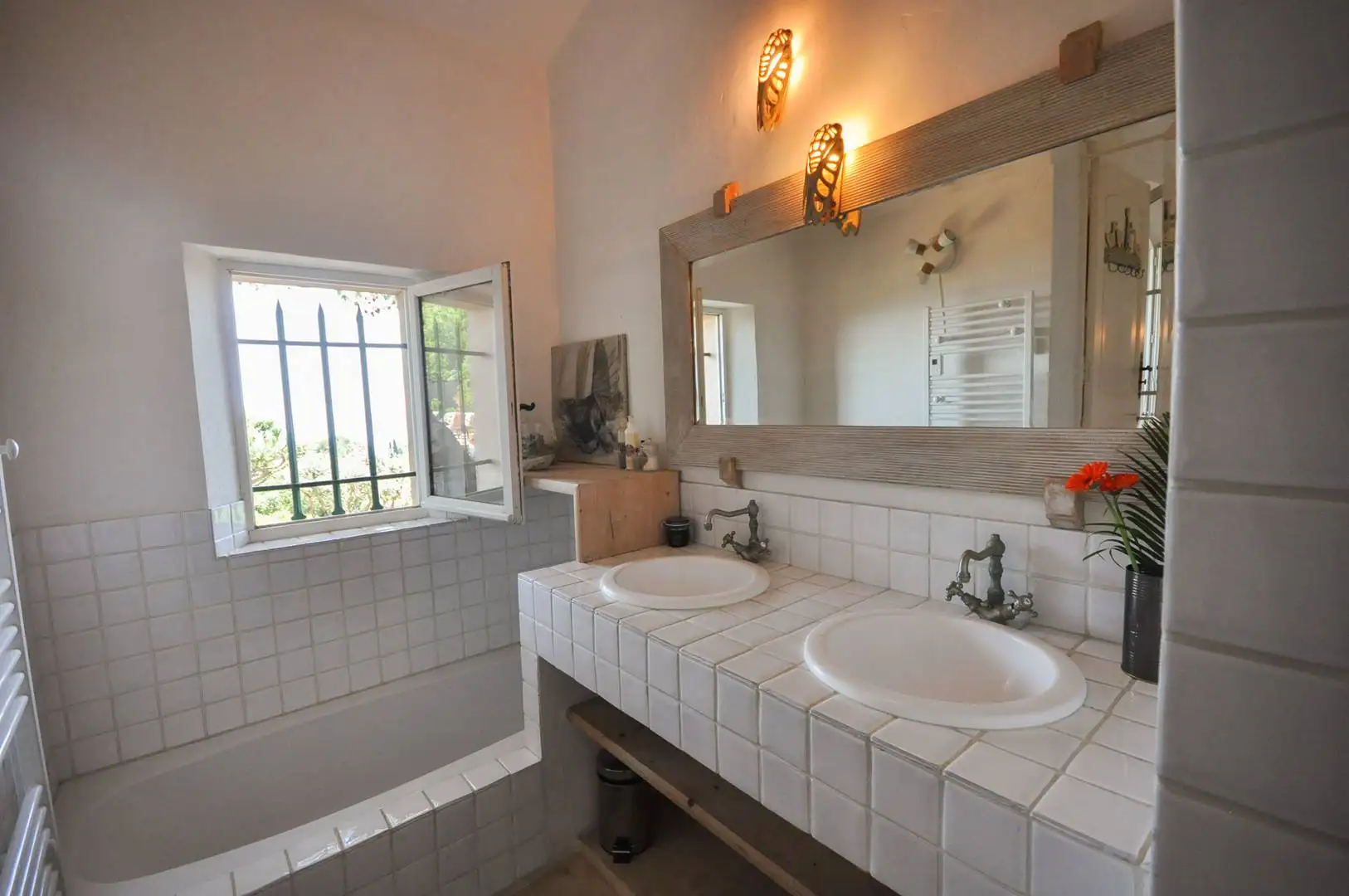 La maison est composée d'un séjour lumineux avec vue sur la mer, d'une cuisine ouverte sur la salle à manger et de 3 chambres climatisées avec chacune sa salle de bain. 2 salle de bain avec douche uniquement et 1 avec baignoire et douche.